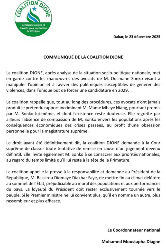Dakar , le 23 décembre 2025_ La coalition DJONE, après analyse de la situation socio-politique nationale, met en garde contre les manœuvres des avocats de M. Ousmane Sonko visant à manipuler l’opinion et à raviver des polémiques susceptibles de générer des violences, dans l’unique but de forcer une candidature en 2029.