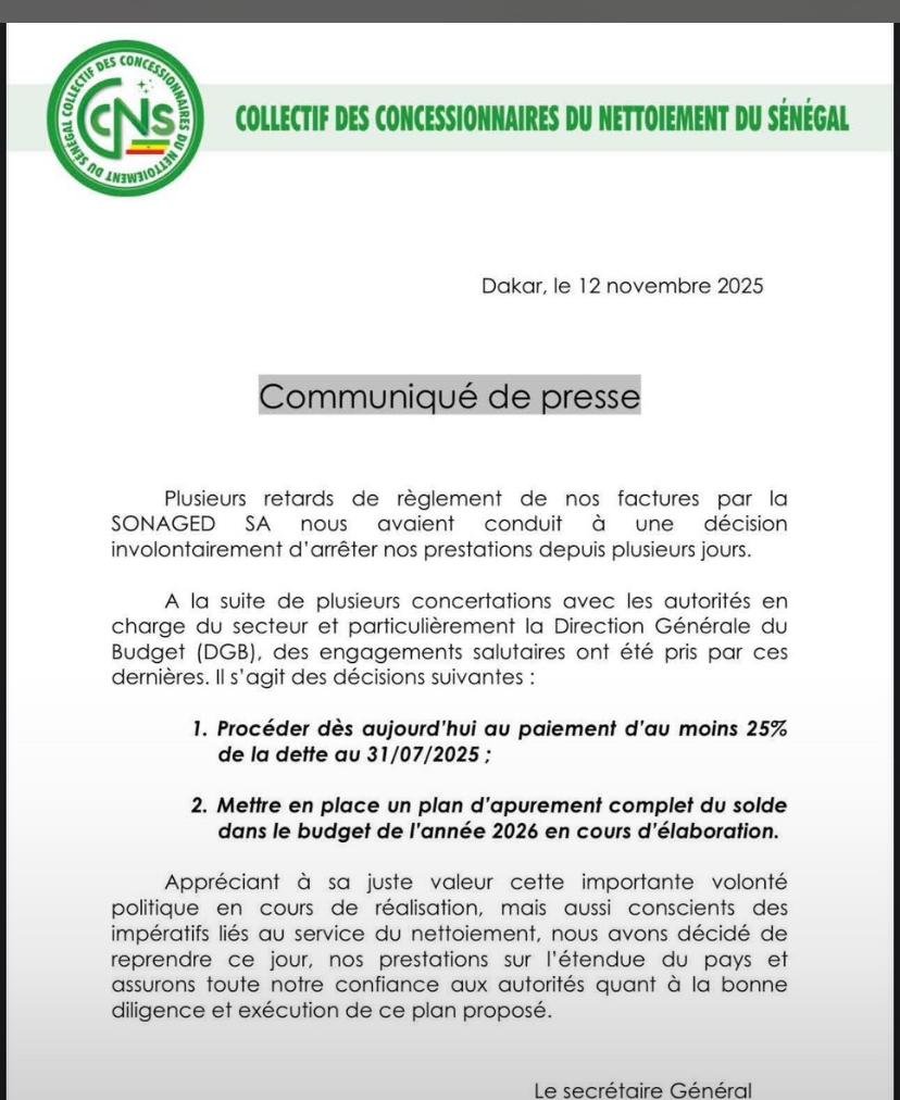 Appréciant à sa juste valeur cette importante volonté politique en cours de réalisation, mais aussi conscients des impératifs liés au service du nettoiement, nous avons décidé de reprendre ce jour, nos prestations sur l’étendue du pays et assurons toute notre confiance aux autorités quant à la bonne