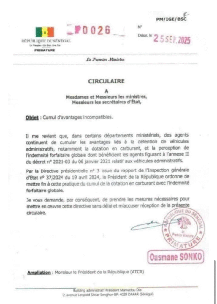 Le Premier ministre, Ousmane Sonko, a adressé une circulaire à tous les membres du gouvernement, pour mettre fin au cumul d’avantages liés aux véhicules administratifs.